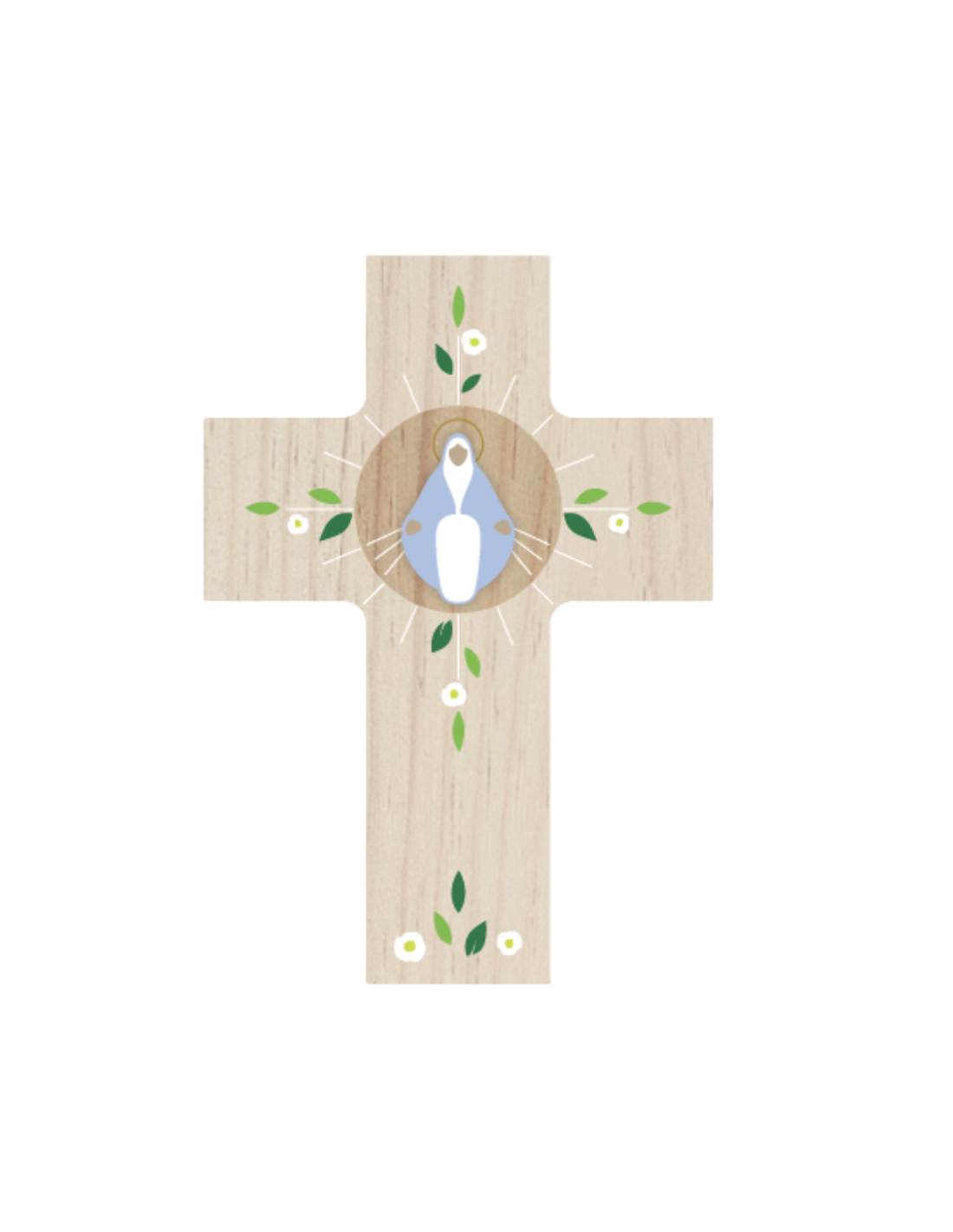 Cette croix est faite en bois naturel et les décors sont peints à la main.