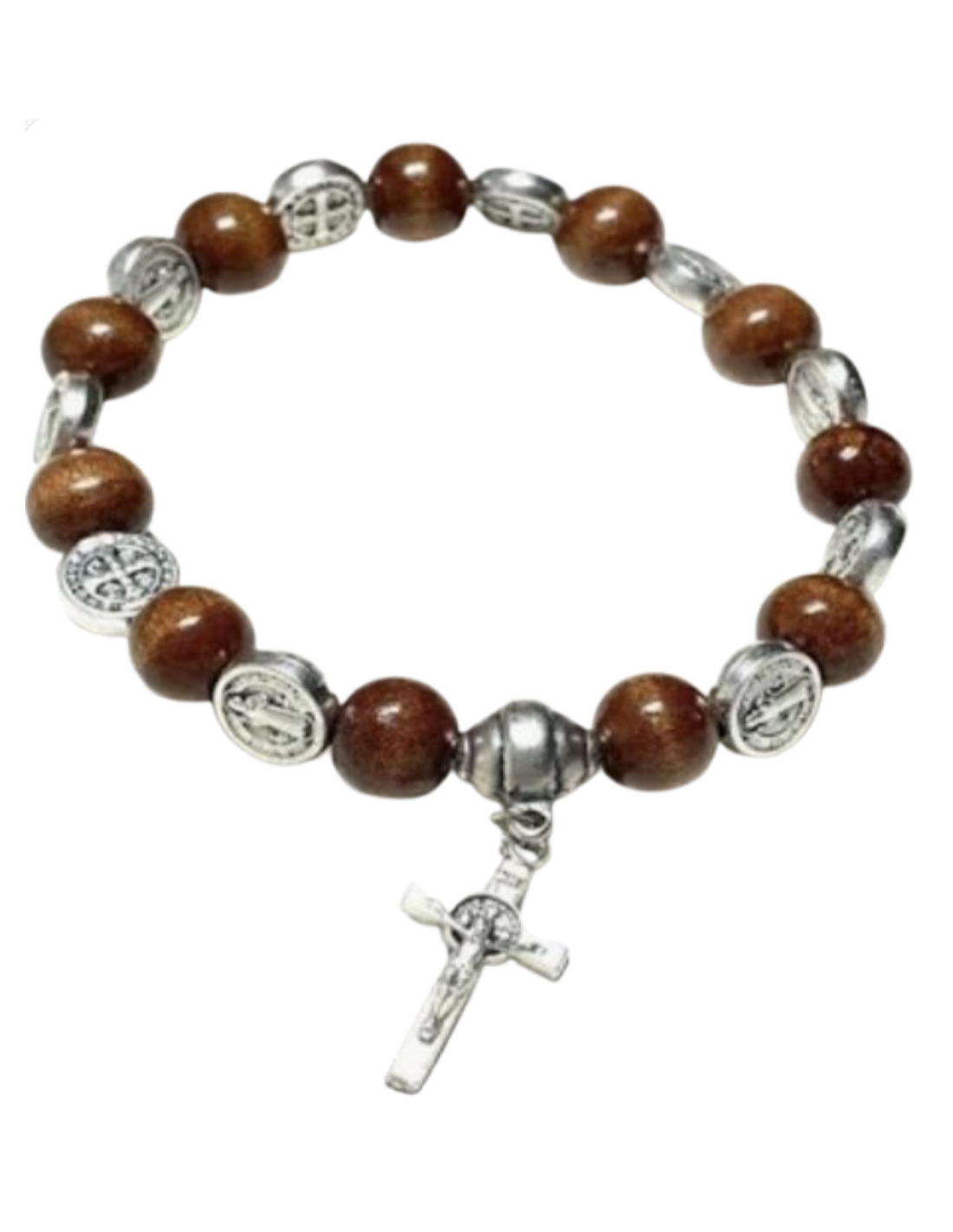 Bracelet en perles de bois d'olivier montées sur élastique, agrémenté d'une croix métal avec Christ.