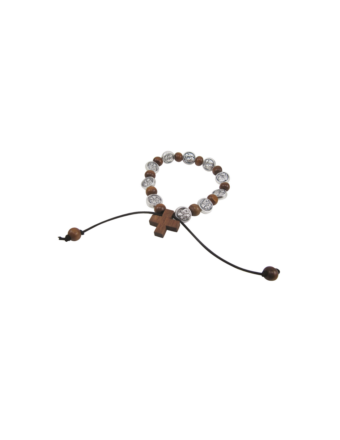 Bracelet en perles de bois, montées sur corde, agrémenté de médailles de Saint Joseph.